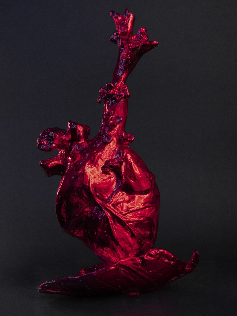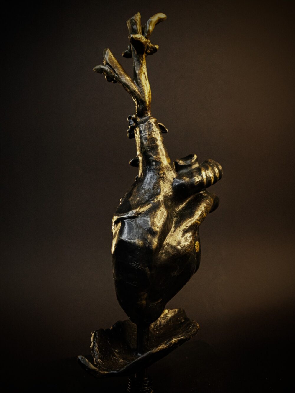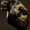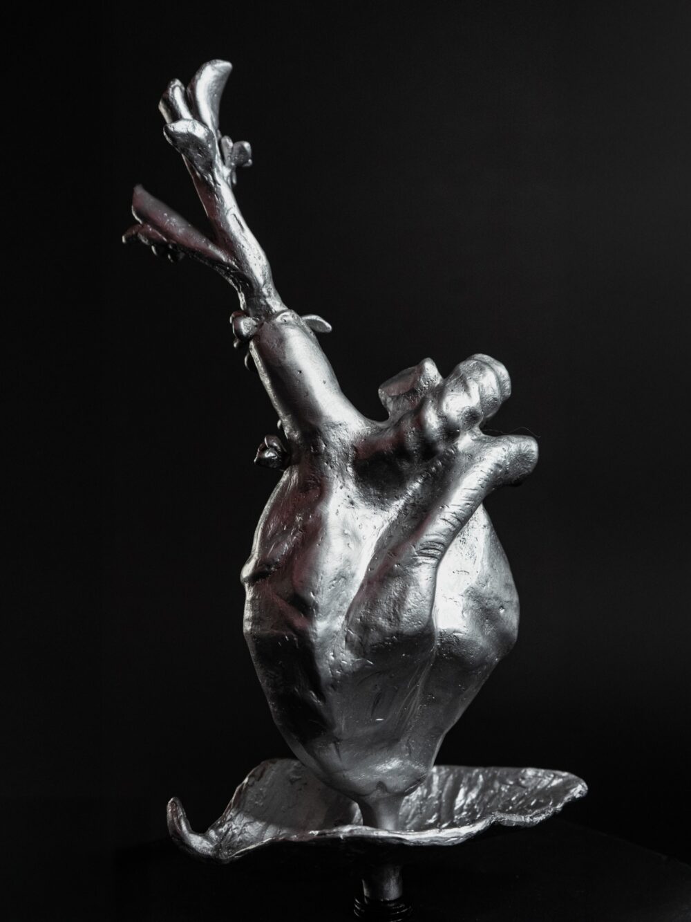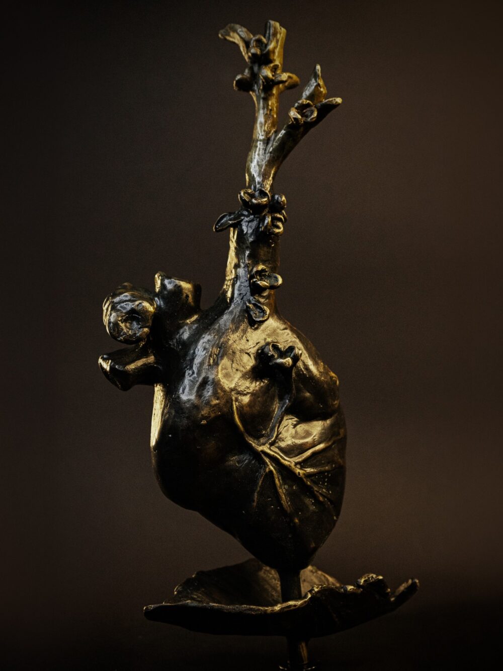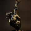 Corazón suspendido que florece en ramas vivas: latido convertido en raíz.