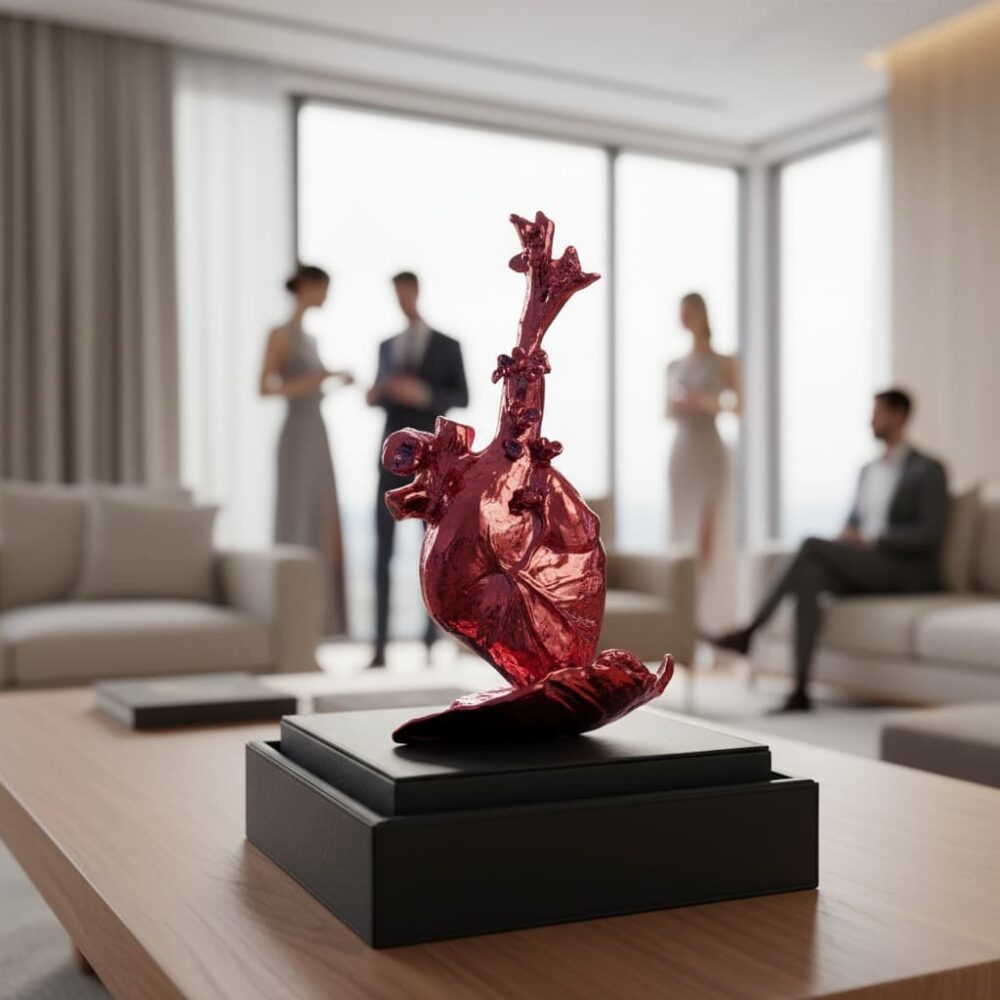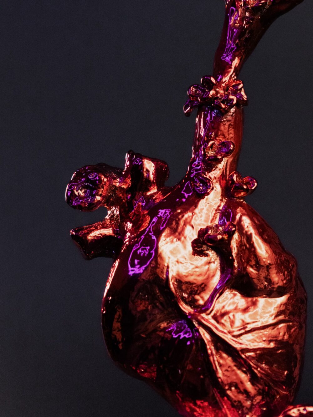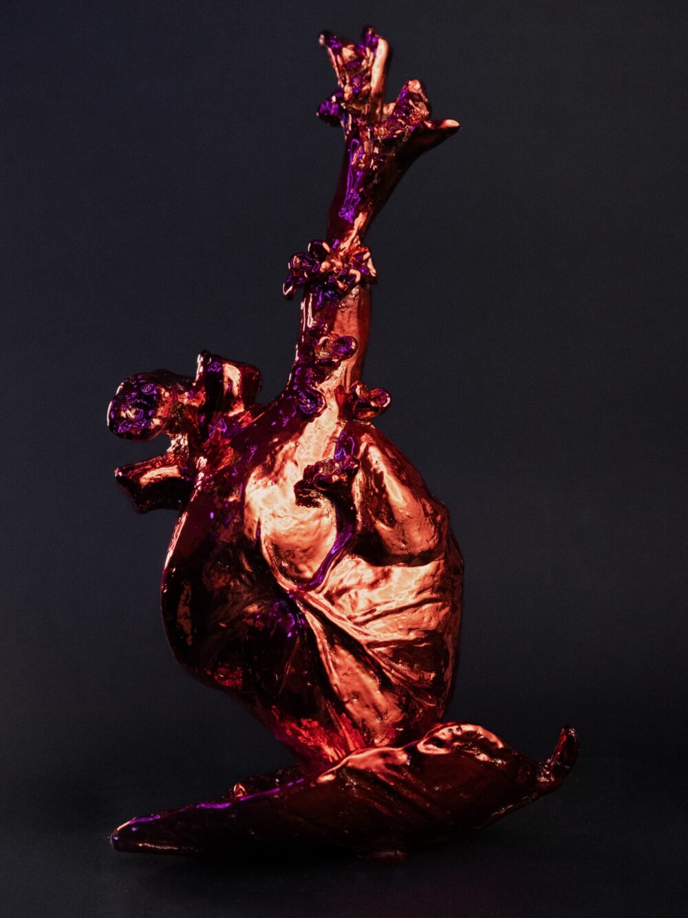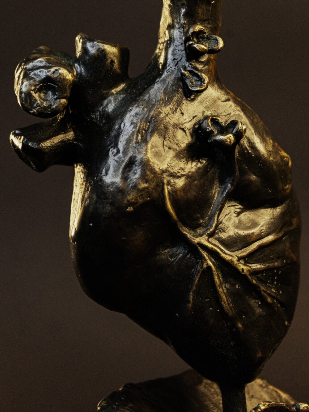 Corazón suspendido que florece en ramas vivas: latido convertido en raíz.