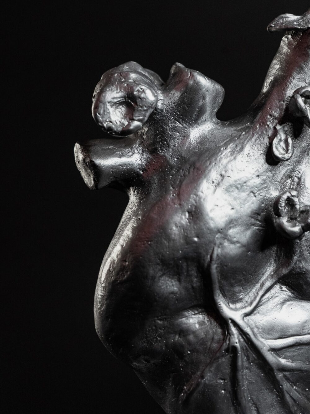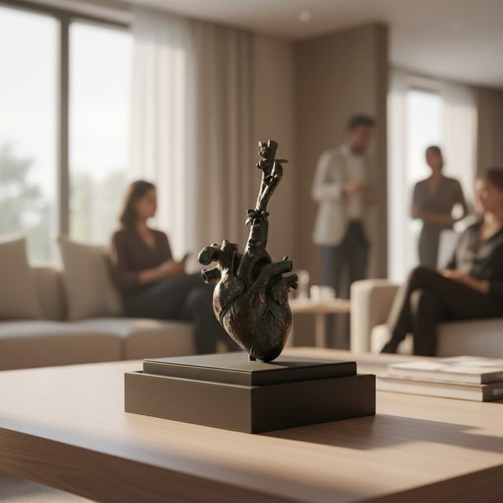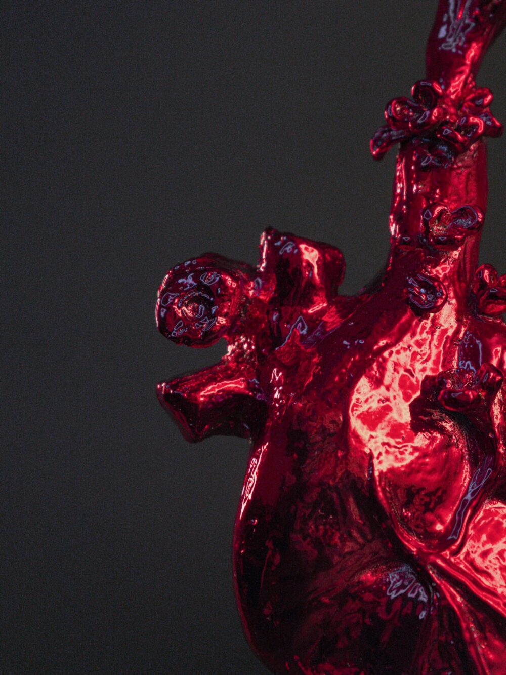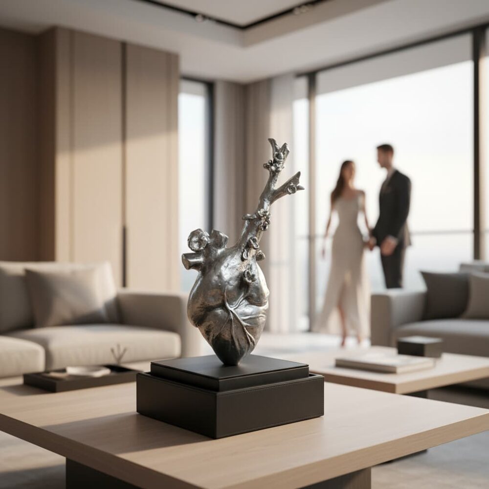 Corazón suspendido que florece en ramas vivas: latido convertido en raíz.