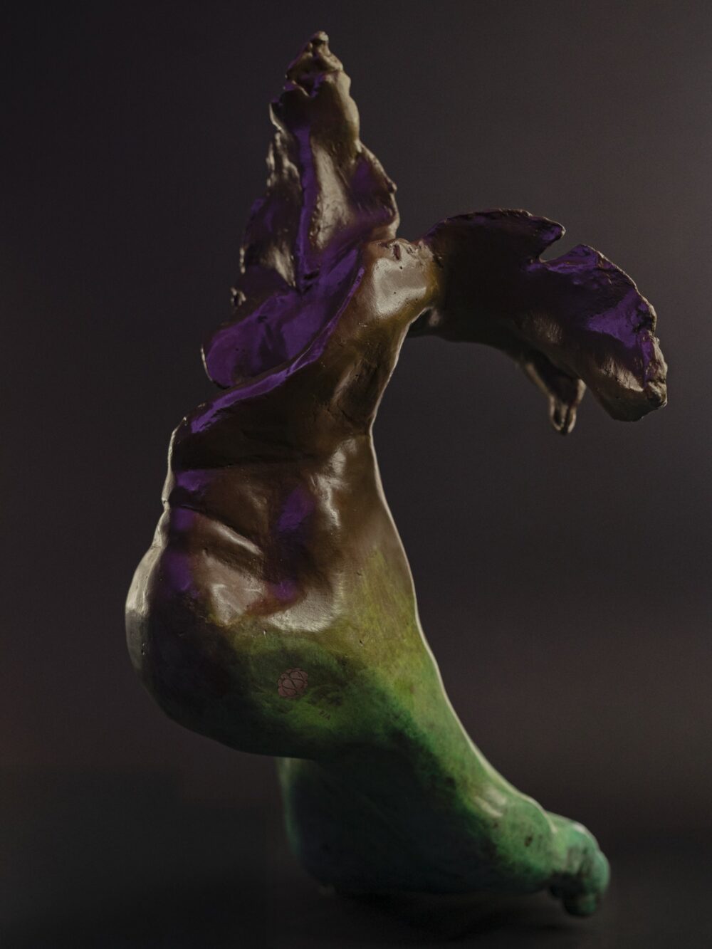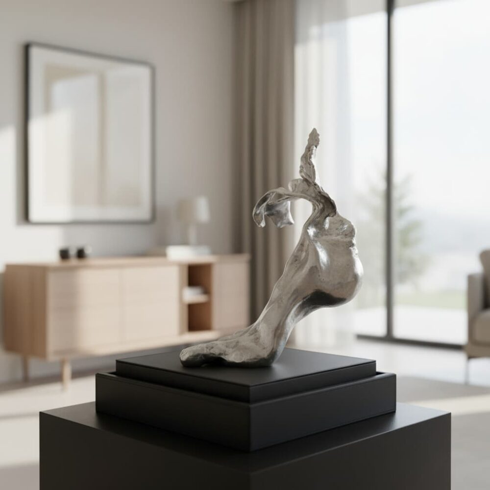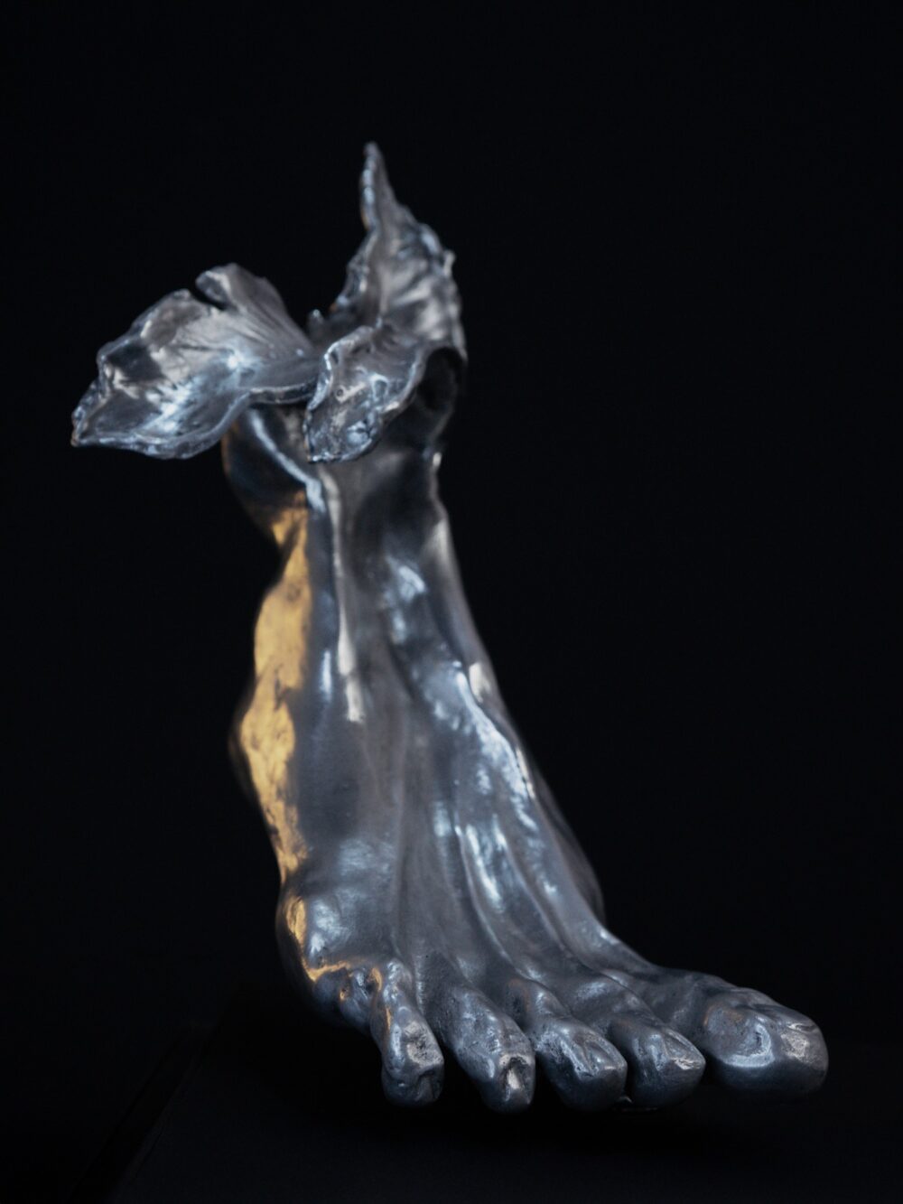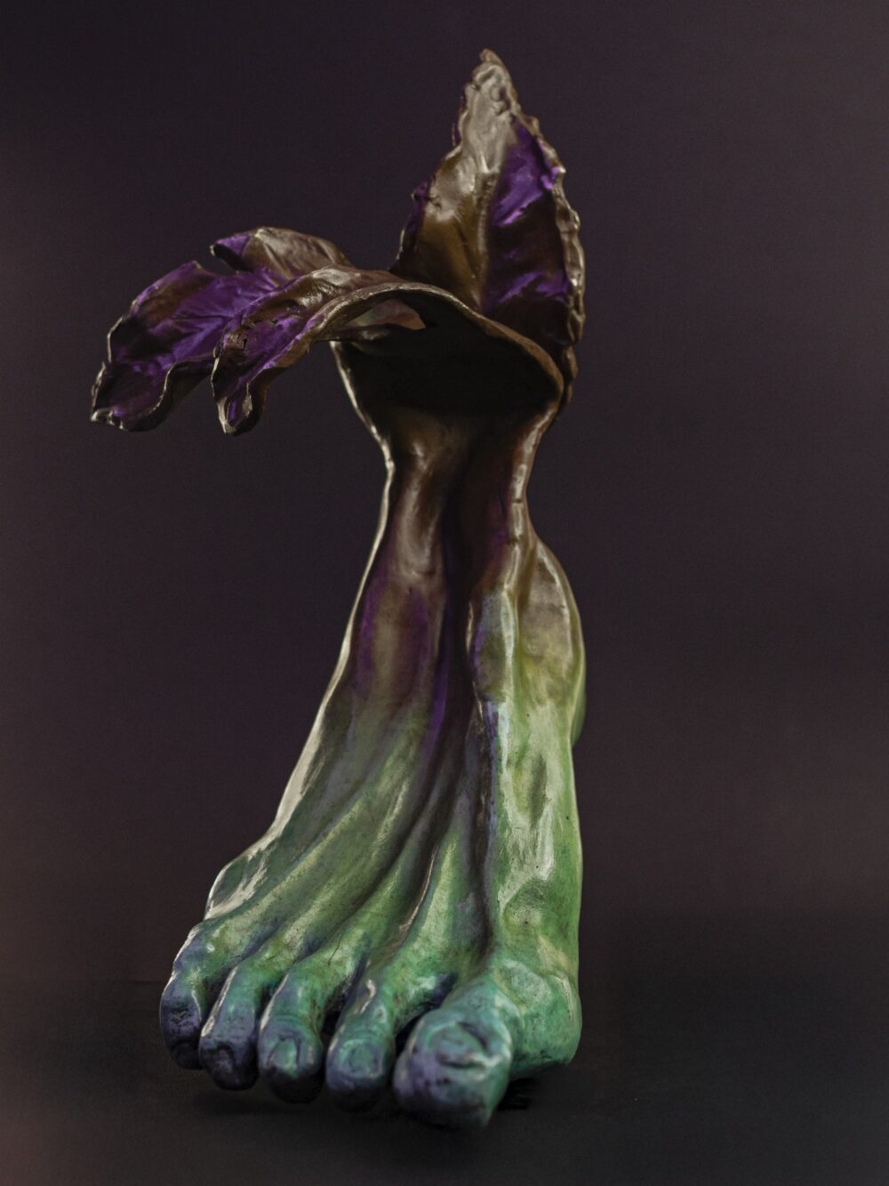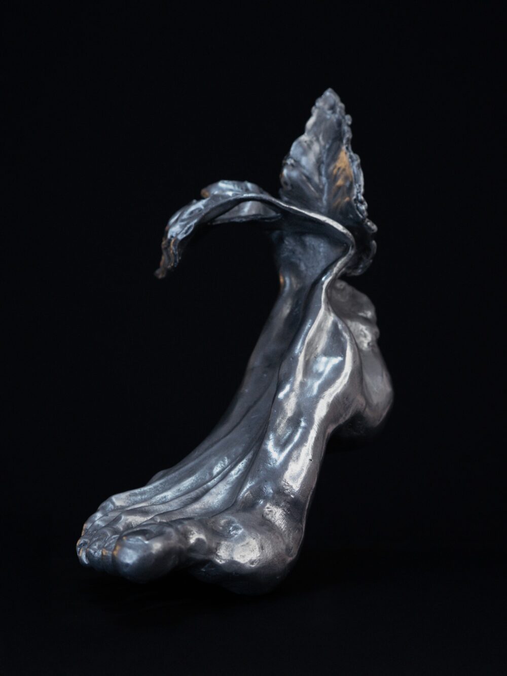 Escultura de un pie que, al tocar la tierra, se transforma en raíz viva. Movimiento que despierta naturaleza.